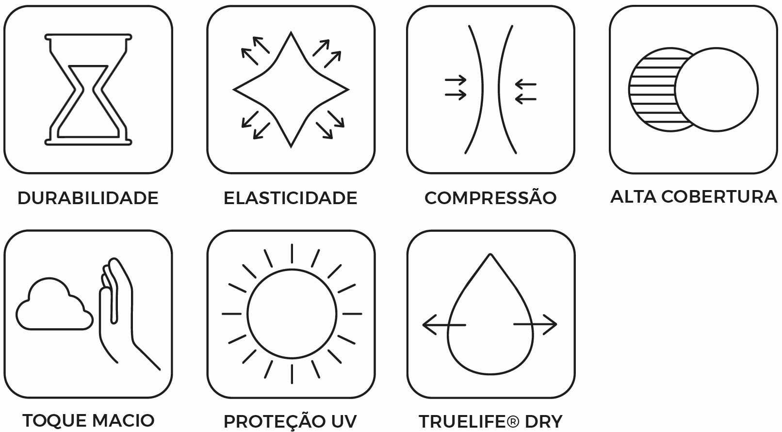 Sua base é feita em um artigo de poliamida com elastano de dupla frontura em construção de fibras filamentadas. Este artigo garante durabilidade, elasticidade, compressão, toque macio, alta cobertura e ZERO TRANSPARÊNCIA.
