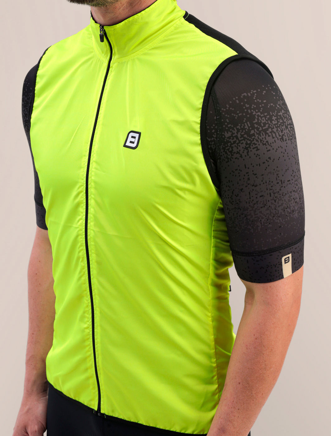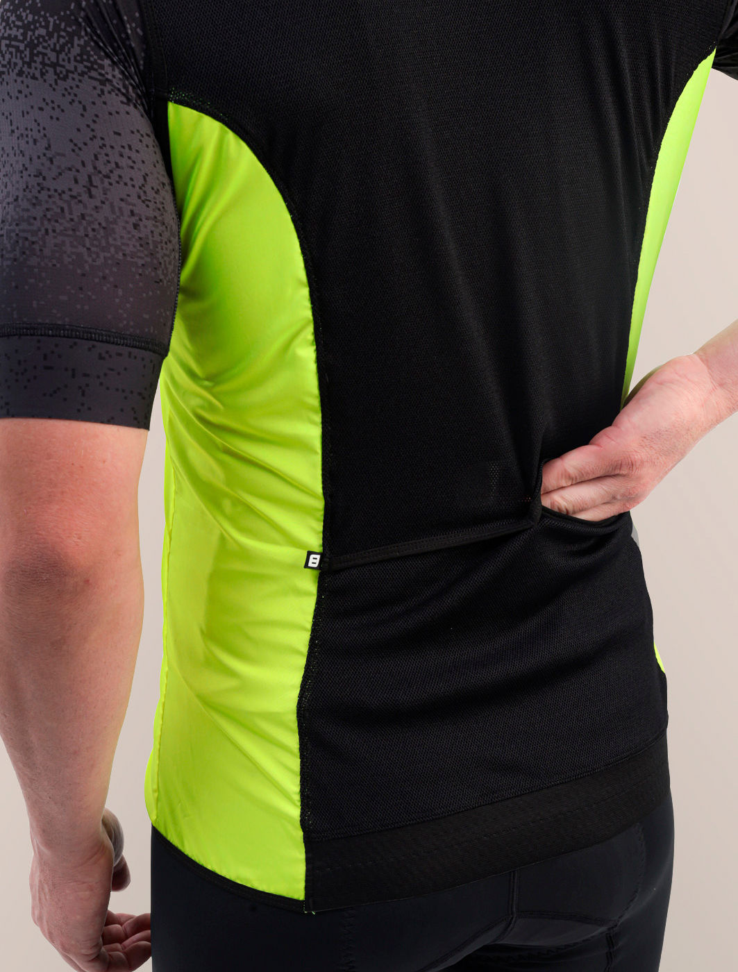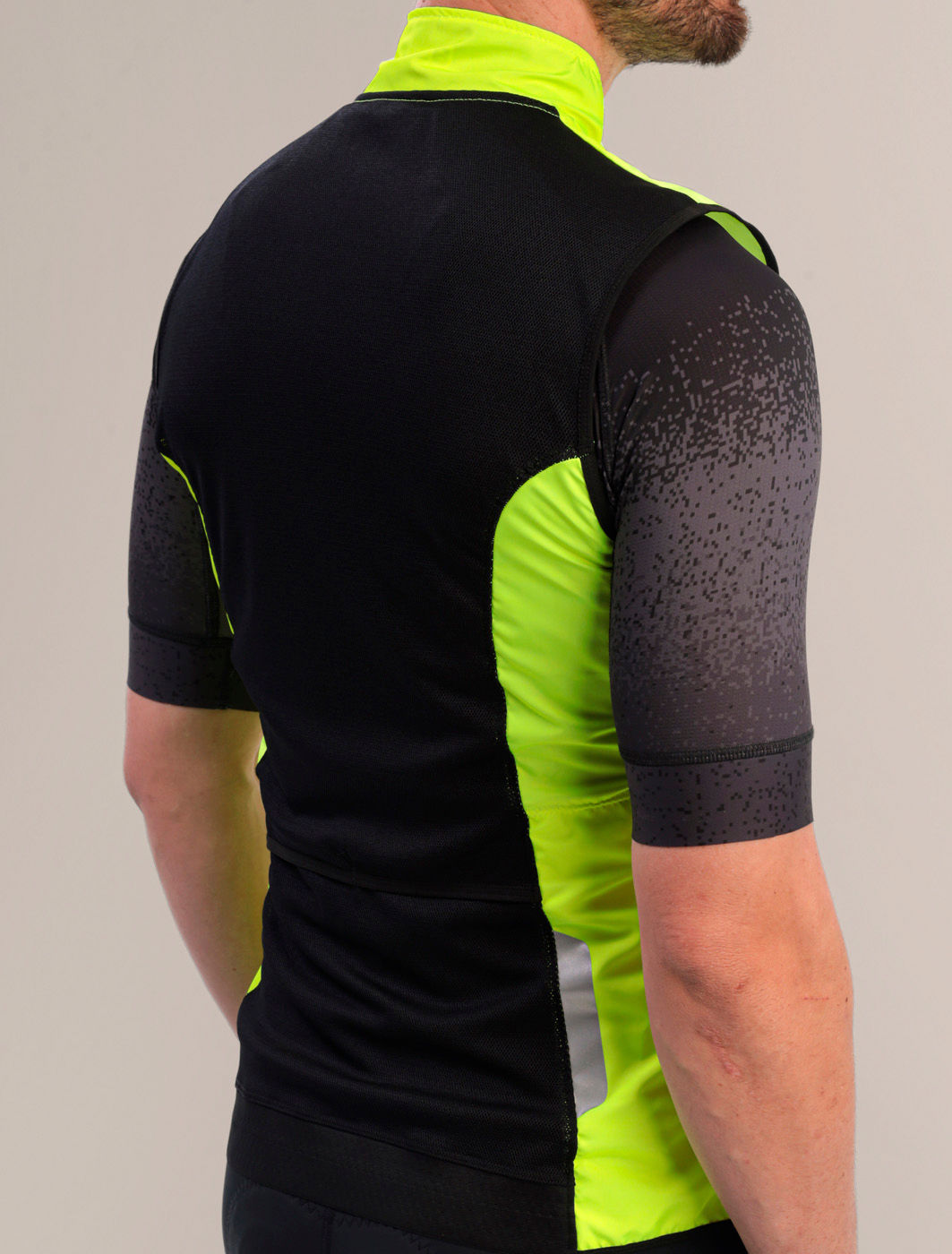 Na parte traseira, o tecido micro perfurado com elastano melhora a respirabilidade e garante elasticidade bidirecional. Isso significa maior conforto, mesmo em pedais longos. As aberturas estratégicas permitem o acesso aos bolsos da jersey sem precisar remover o colete.