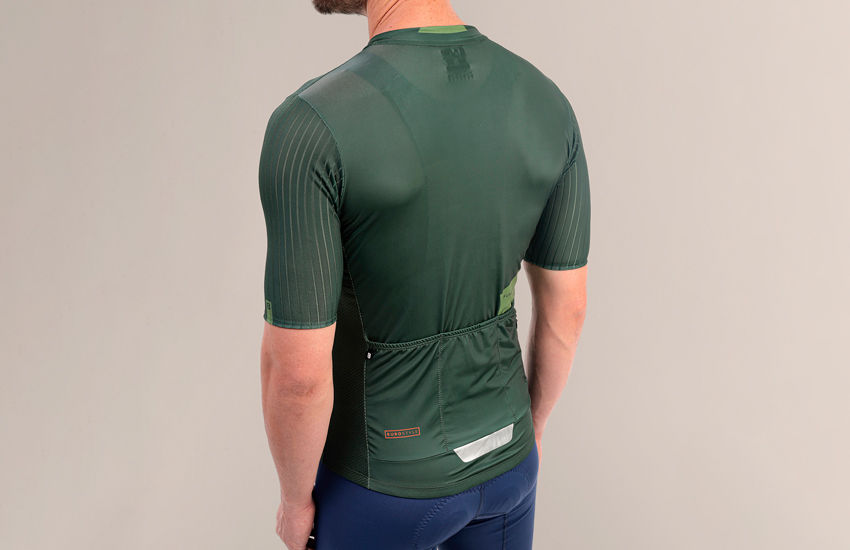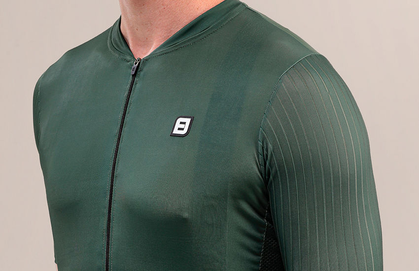 Frontais e traseiros: na região frontal e traseira da jersey, a utilização de poliéster com elastano com travamento vertical oferece uma base robusta que suporta o armazenamento de objetos nos bolsos traseiros sem comprometer a forma da peça. Esse tecido é projetado para oferecer elasticidade, leveza e um toque gelado, ideal para manter o ciclista fresco e confortável durante o pedal.