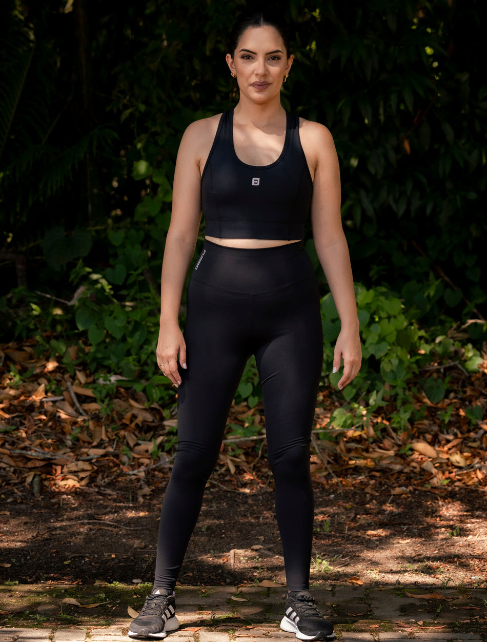 A legging de compressão é uma peça longa, ajustada ao corpo, desenvolvida com poliamida de alta tecnologia e elastano. Sua principal característica é o ajuste anatômico, garantindo mobilidade e suporte muscular. Já a bermuda de compressão é uma versão mais curta, geralmente até a altura do meio da coxa, também confeccionada com tecido tecnológico de alta elasticidade e zero transparência.