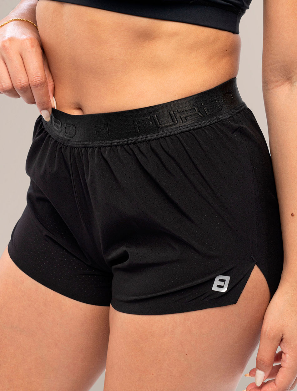 O Shorts Fem. Running Race foi projetado para máxima mobilidade, com aberturas laterais e acabamento sem costura, utilizando fita selante italiana. Essa construção reduz o atrito, proporciona um toque leve na pele e permite movimentos amplos em diferentes direções, ideal para provas rápidas.