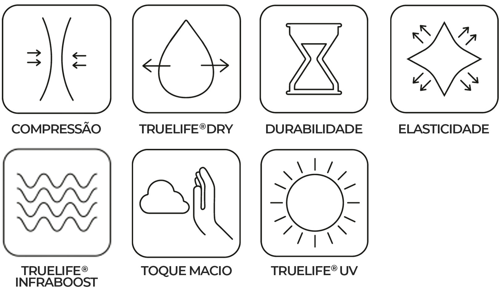 Tratando sobre tecidos, a Calça Bretelle Masculina Fuga vem tudo o que há de mais tecnológico em sua composição. Sua base de tecido possui a Tecnologia Truelife® INFRABOOST, a qual possui a incorporação permanente de minerais naturais em seu fio de poliamida inteligente. Estes minerais auxiliam na performance esportiva, absorvendo o calor do corpo e emitindo raios infravermelhos longos de volta a pele, causando a ativação celular profunda, a qual revigora o corpo. Em contato com a pele, a Tecnologia Truelife® INFRABOOST oferece ainda outros benefícios, tais como: aumento da elasticidade muscular para uma melhor performance, melhora da recuperação muscular pós treino ou provas, e aumento do conforto e bem-estar. Quanto maior a área e o tempo de contato da tecnologia com a pele, mais potencializado o efeito será. Por ser uma aplicação permanente ligada ao fio, dura por toda a vida útil da peça e sua performance não altera independente do número de lavagens.