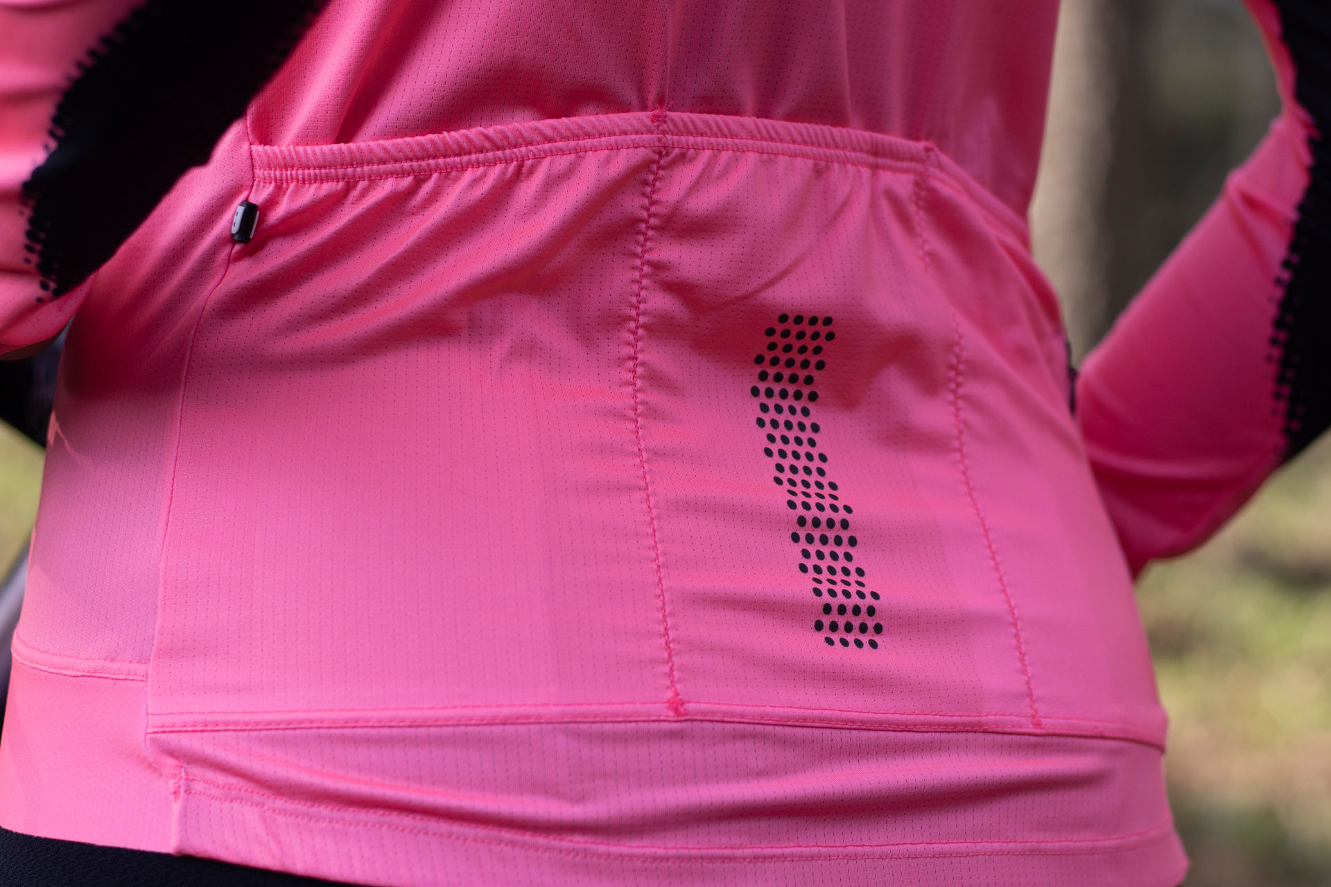 Praticidade e matérias-primas: dentre as suas principais características, ela possui 4 (quatro) bolsos traseiros (sendo um deles com zíper), que são úteis para transportar pequenos objetos durante o seu treino ou prova. Além disso, possui zíper frontal inteligente (facilitando na abertura ou fechamento), lapela frontal protetora (para evitar qualquer atrito entre o fecho do zíper e a pele) e gola baixa. Na barra frontal, a Camisa Manga Longa Glow Ciclismo possui um elástico com pigmentos de silicone, e na barra traseira, possui um elástico com filetes de silicone, ambos garantindo uma incrível aderência da peça ao corpo.