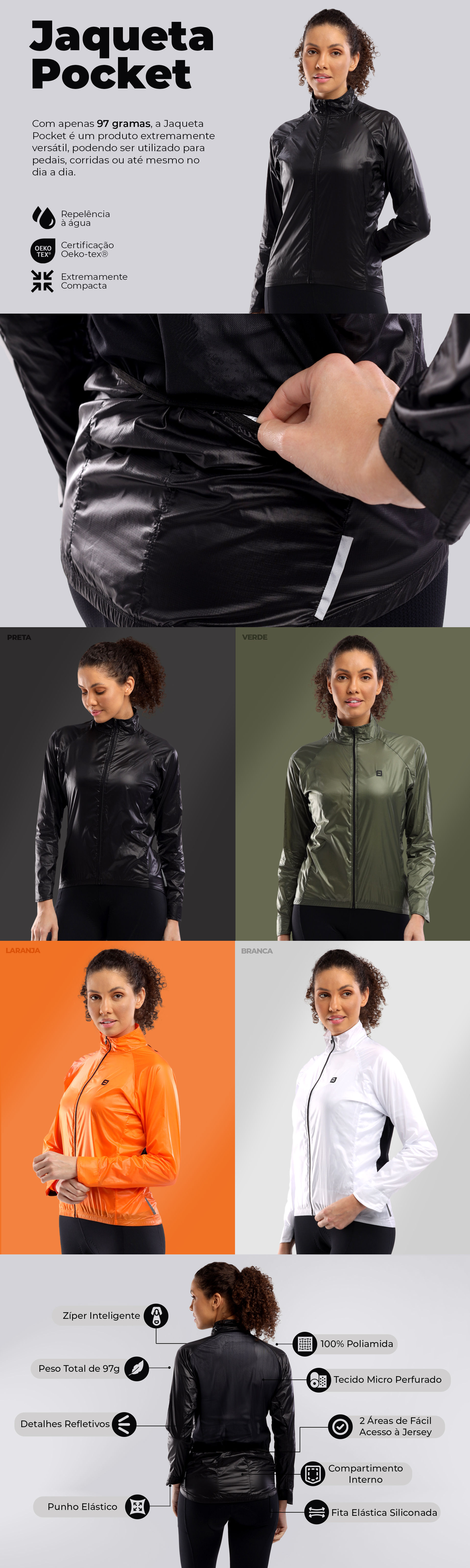 Trouxemos a Jaqueta Corta Vento Feminina Pocket com o objetivo de garantir extrema leveza, versatilidade e conforto para os seus pedais, corridas e dia a dia.