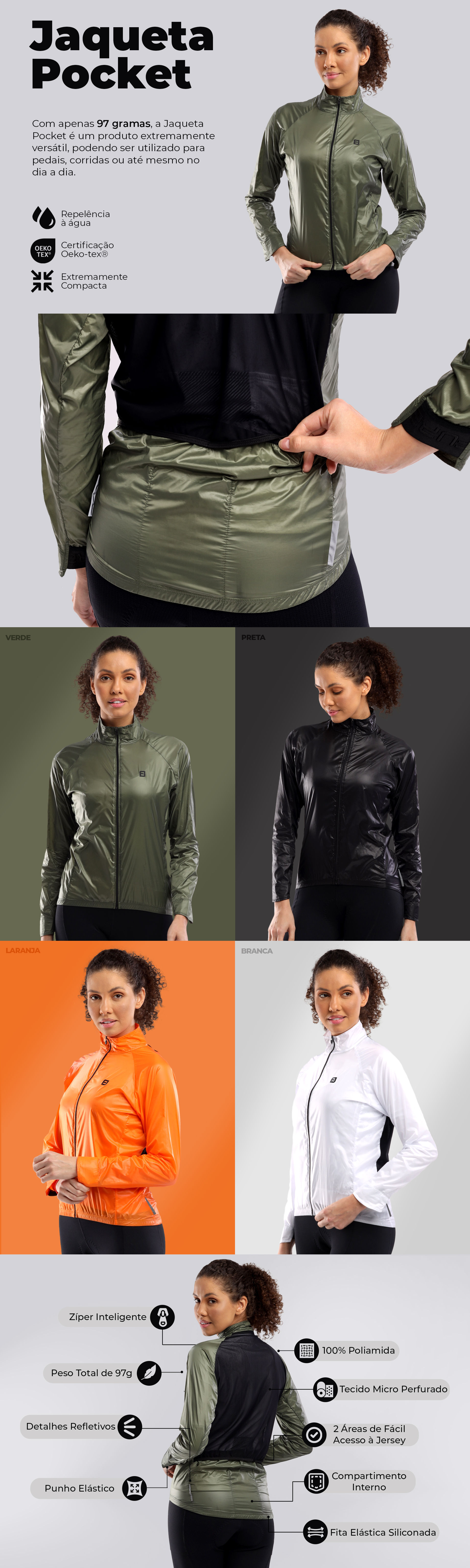 Trouxemos a Jaqueta Corta Vento Feminina Pocket com o objetivo de garantir extrema leveza, versatilidade e conforto para os seus pedais, corridas e dia a dia.