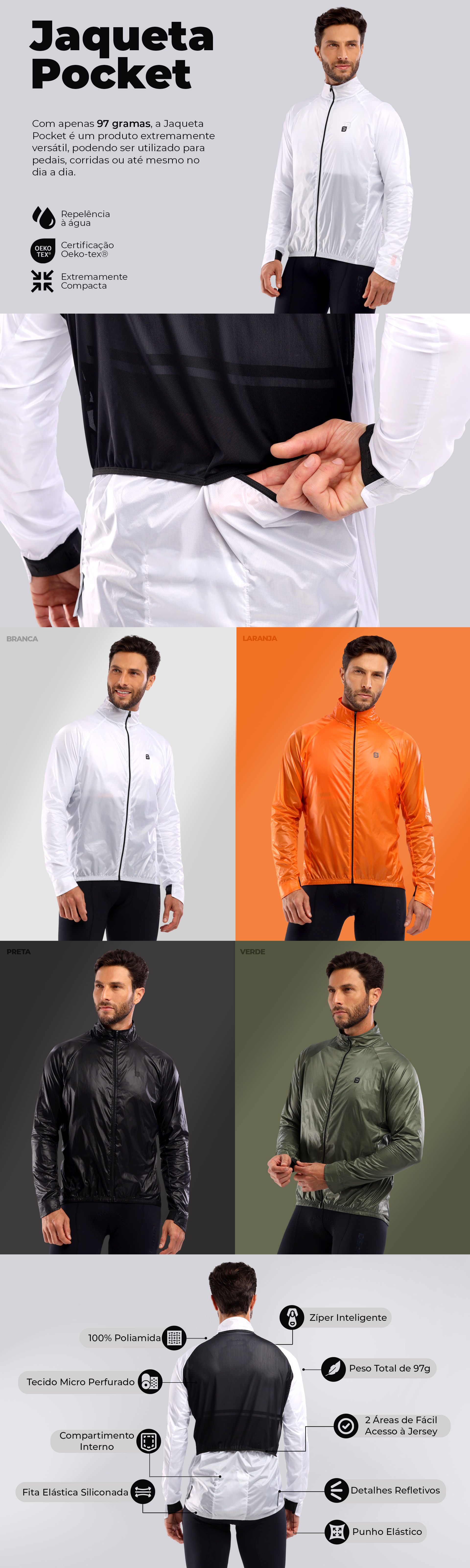 Trouxemos a Jaqueta Corta Vento Branca Pocket com o objetivo de garantir extrema leveza, versatilidade e conforto para os seus pedais, corridas e dia a dia.