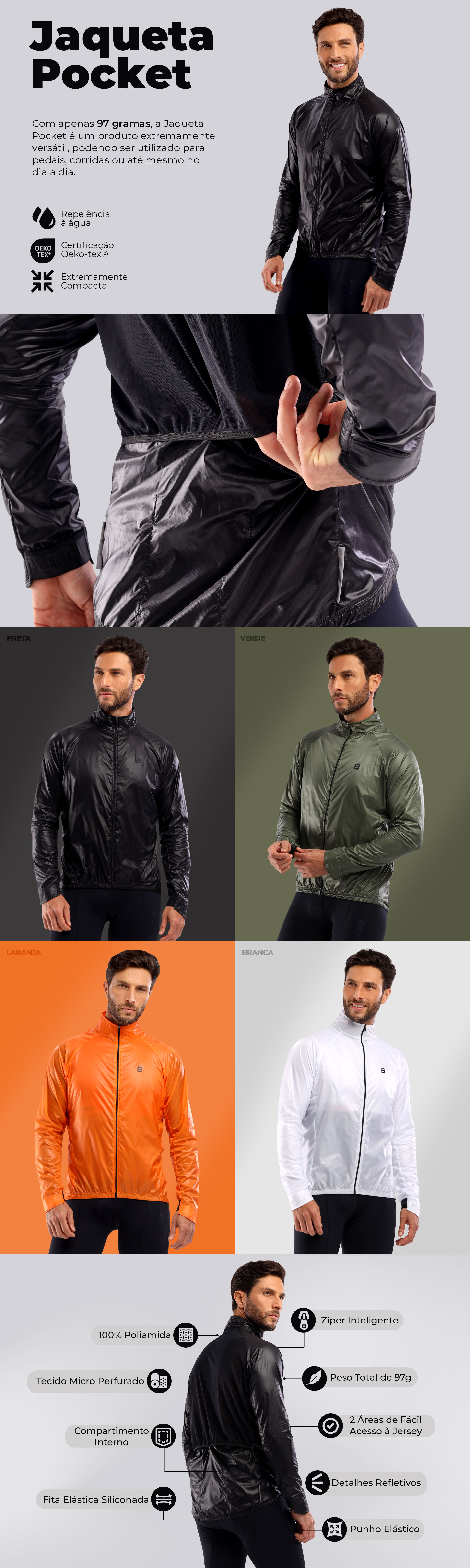Além da sua leveza, sua base frontal de poliamida possui acabamento repelente à água (Water Repelent). Desta forma, além da ampla proteção contra o vento, a Jaqueta Corta Vento Masculina Pocket garantirá uma ótima repelência à água durante os seus treinos e/ou competições em dias de chuvas leves ou garoas. Seu tecido frontal possui ainda a certificação Oeko-tex®, a qual é concedida para matérias-primas que atendam a rigorosos critérios de segurança e sustentabilidade, garantindo que a sua base de tecido é livre de substâncias nocivas. Já nas suas costas, a Jaqueta Corta Vento Masculina Pocket possui uma base de poliamida micro perfurada de alto apelo tecnológico, garantindo uma ótima elasticidade bilateral, além de uma incrível respirabilidade. Além disso, a Jaqueta Corta Vento Masculina Pocket possui nas costas duas áreas de acesso onde você poderá inserir ou remover objetos no bolso da sua jersey de ciclismo, sem que haja a necessidade de levantar ou retirar a sua Jaqueta Corta Vento Masculina Pocket.