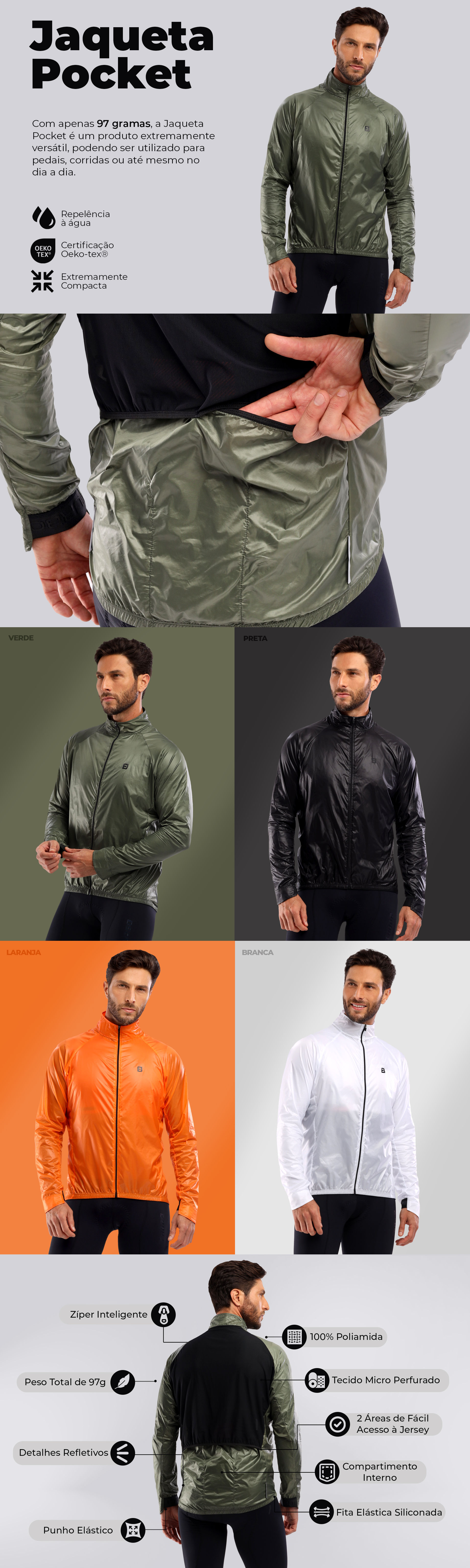 Leveza e versatilidade descrevem perfeitamente a Jaqueta Corta Vento Masculina Pocket. Ela possui incríveis 97 gramas de peso total, se tornando um produto extremamente leve. Além da sua leveza, a Jaqueta Corta Vento Masculina Pocket possui um compartimento interno onde ela poderá ser enrolada e guardada dentro deste compartimento, ficando extremamente compacta e cabendo na palma da sua mão ou no bolso da sua jersey de ciclismo. Esta versatilidade possibilita que você possa sair de casa em dias frios com total proteção e guardando-a assim que esquentar. Simples assim, com muito conforto e ZERO preocupação!