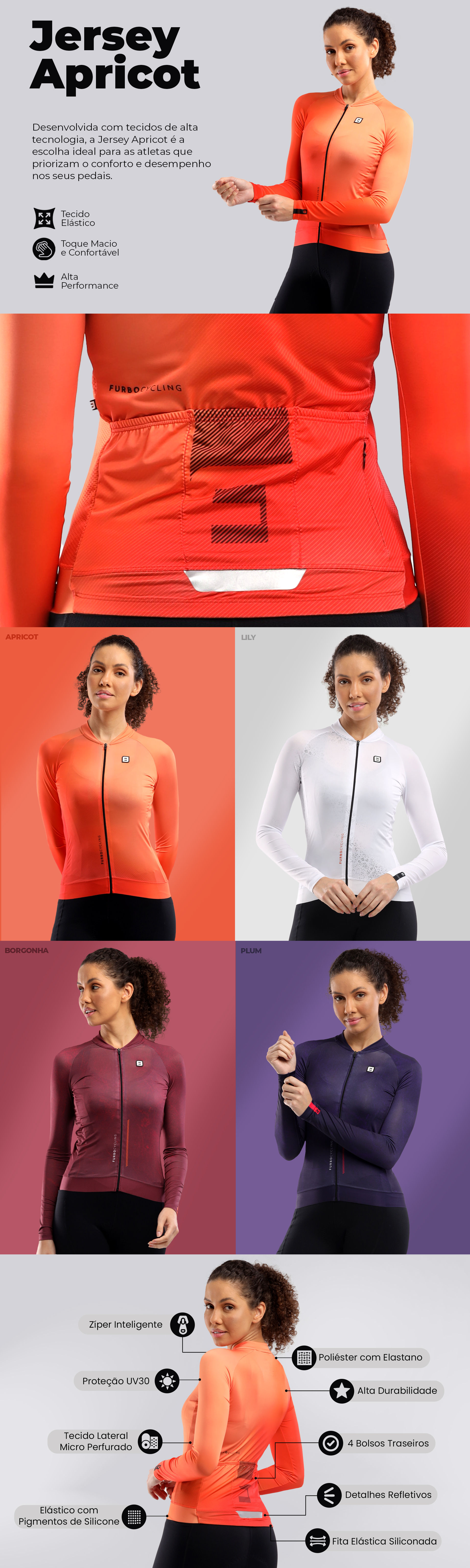 Dentre as suas principais características, a Jersey Feminina Apricot possui 4 (quatro) bolsos traseiros (sendo um deles com zíper), que são úteis para transportar pequenos objetos durante os seus pedais. Além disso, ela possui mangas longas com acabamento em punho dobrado, zíper frontal inteligente (facilitando na abertura ou fechamento), e elástico siliconado na barra, garantindo que a camisa de ciclismo fique no lugar correto durante os seus treinos e/ou competições.