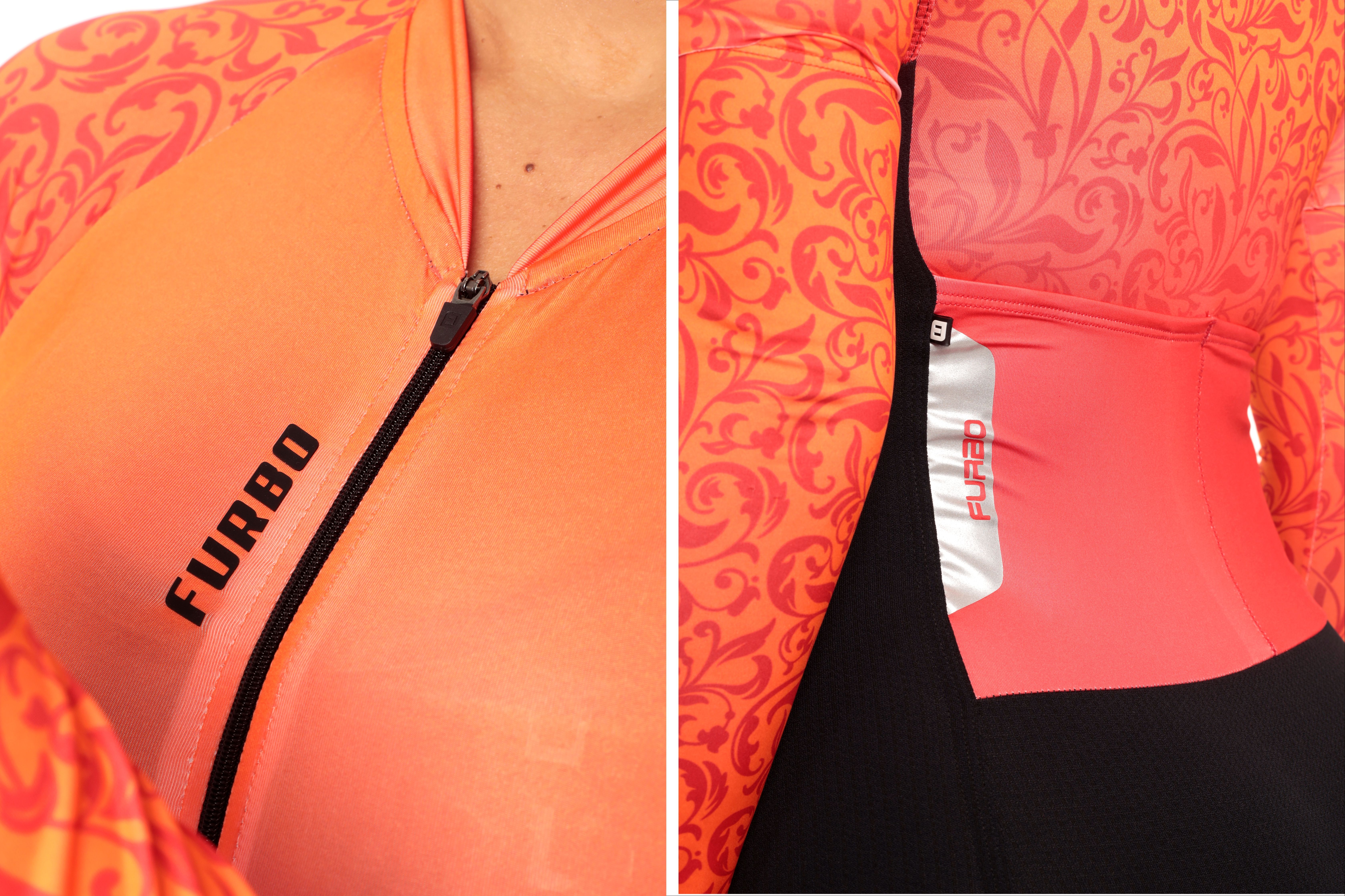 Funcionalidades: O Macaquinho Ciclsimo Feminino vem acompanhado de um par de MANGUITO na mesma arte, como uma forma de extensão da sua manga 3/4 com acabamento em corte à laser. Seu manguito possui as mesmas tecnologias de tecido, e caberá à você escolher se o usará com ou sem ele. Além disso, ele possui 3 (três) bolsos traseiros (sendo um deles com zíper invisível), que são ideais para guardar pequenos objetos, alimentos ou ferramentas. Seu zíper frontal é inteligente, facilitando na abertura ou fechamento durante os pedais. Suas costuras são planas e minuciosamente reforçadas, garantindo que não haja nenhum atrito incômodo entre a pele e o Macaquinho Ciclismo, além de uma incrível resistência nas mais altas compressões, promovendo uma alta durabilidade. Na região das axilas, ele possui um tecido micro perfurado, garantindo uma incrível respirabilidade. E nas barras, ele possui um tecido com filamentos de silicone, que proporciona uma ótima aderência da peça ao corpo, fazendo com que a barra não enrole ou se mova de lugar.